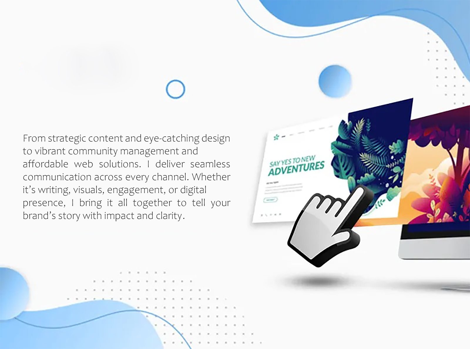 Turning ideas into stunning visuals that connect, inspire, and convert. Let’s bring your brand to life one bold design at a time. Your one-stop creative powerhouse: compelling content, sleek graphic design, vibrant social and community management, and affordable web design — all crafted to grow your brand without breaking the bank.